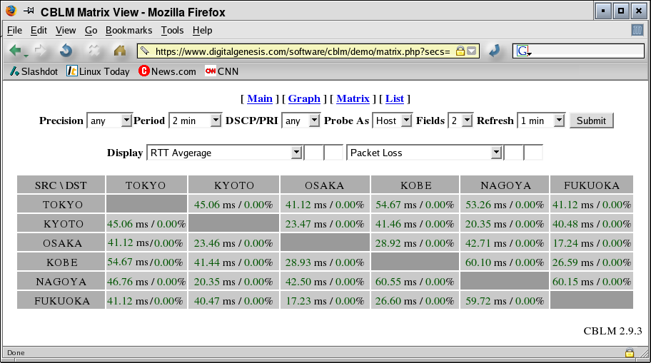 CBLM tracks round trip time (RTT), one-way trip time (OTT), jitter, packet loss, CoS (DSCP and VLAN priority) markings, out of order packets, and duplicate packets. The round trip time, one-way trip time and jitter values allow you to see how your network performs over time. The packet loss values allow you to watch for congestion and circuit issues. The out of order and duplicate packet counts let you watch for network convergence issues and CBLM's tracking of CoS marking can be used to determine if your networks CoS configuration is consistent from end to end.